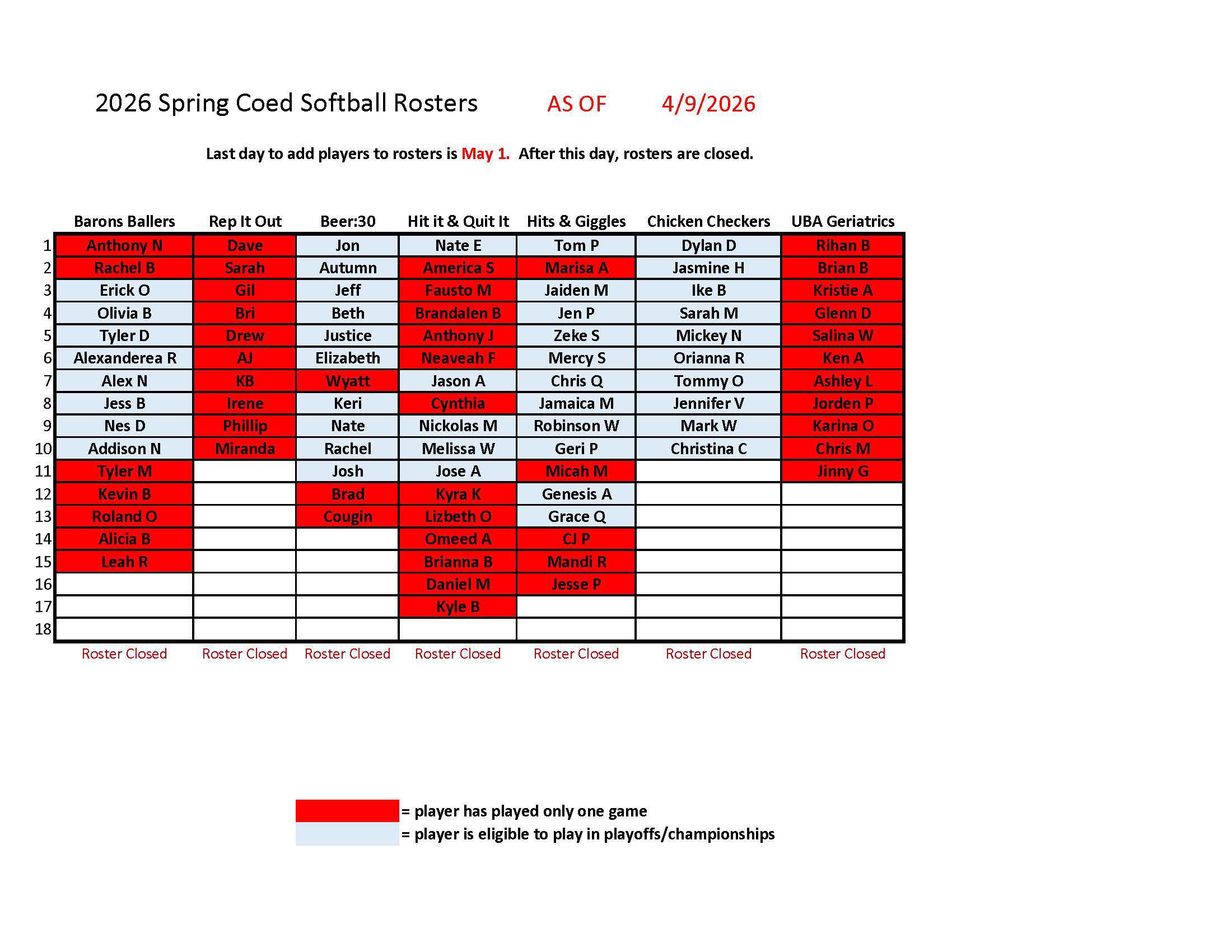 See below for updated schedule & team rosters