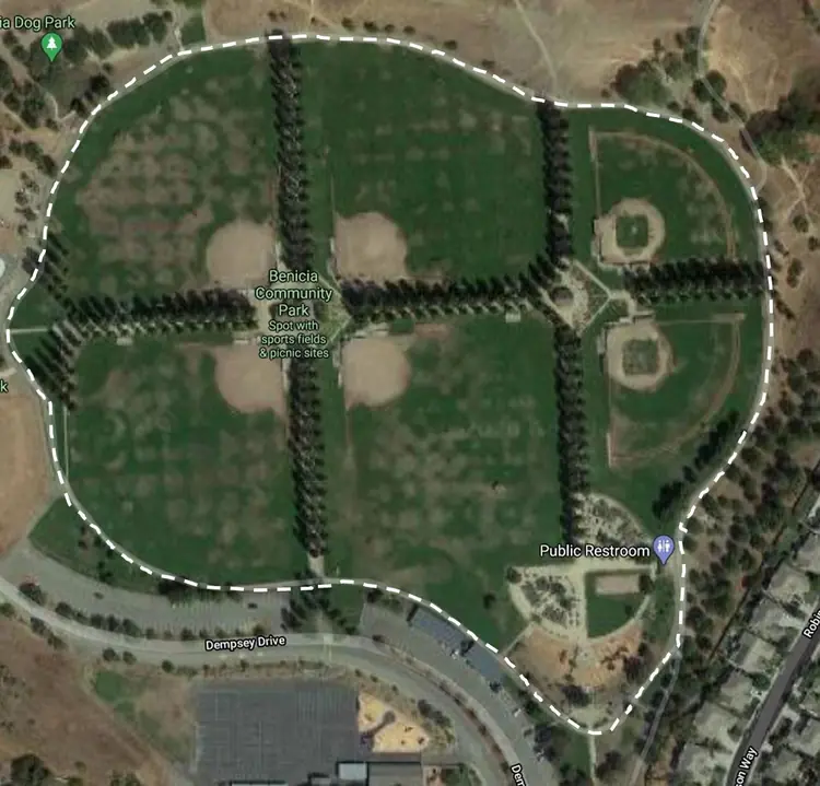 This paved path can is in Benicia Community Park. The path makes a full loop around the park fields and playground area.