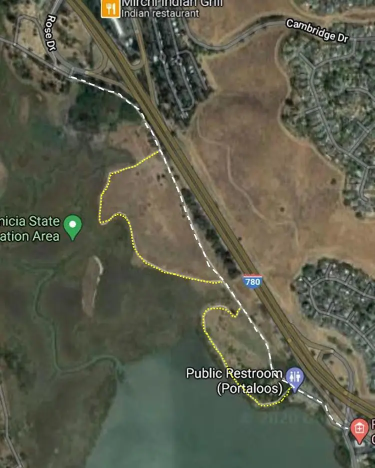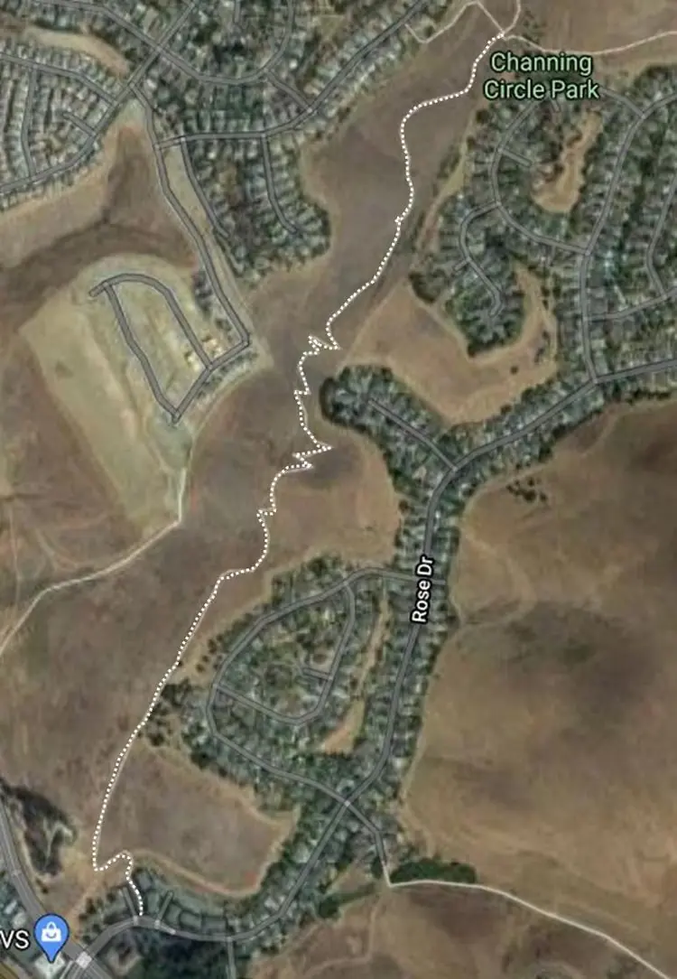 This dirt path can be accessed off of the Rollye Wiskerson trail near Channing Circle Park. (Other access points in Vallejo are available). The access point on the opposite end is at the rear of the KinderCare parking lot off Rose Drive (near Benicia Road).