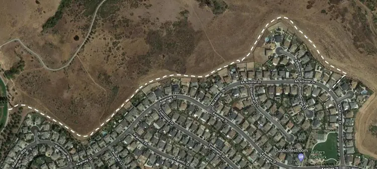 This dirt path can be accessed in the Benicia Community Park near the little league fields on the east side of the park (near the 2nd tee box for Disc Golf). The opposite access point is on McAllister Drive, between 624 & 652 McAllister.