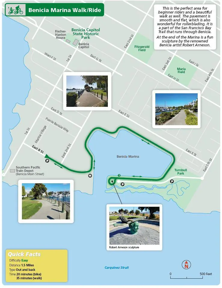 From a brochure highlighting well loved biking/walking paths in Benicia, this route will take you around the walking path at the Marina.